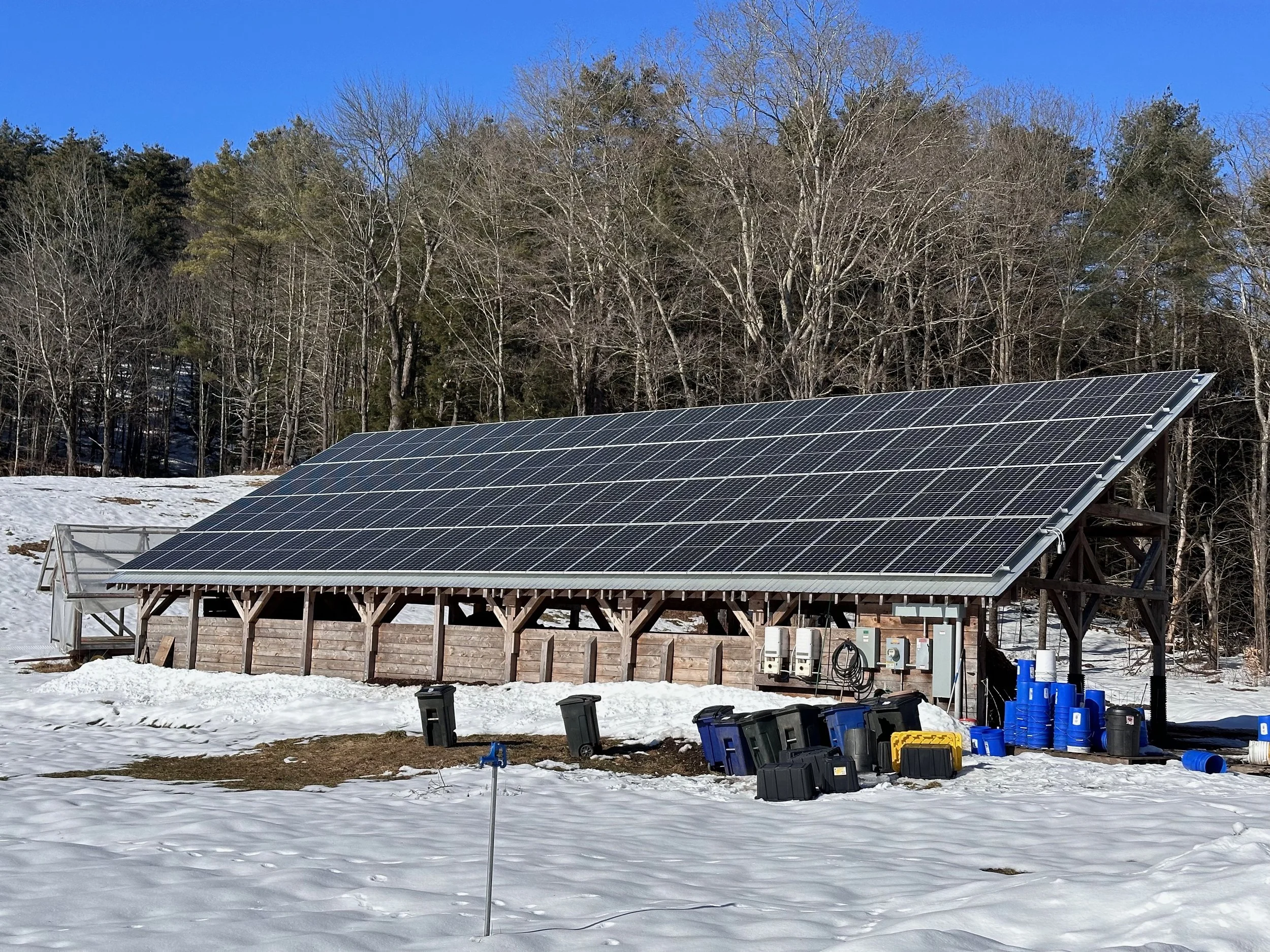 The south-facing roof holds a 30 kW photovoltaic array and the bays underneath are for our actively managed static pile compost system